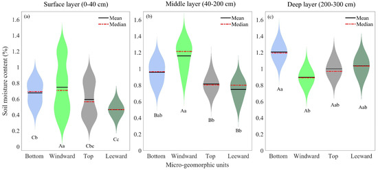 4.1. Variability in Soil Moisture with Three Depth Layers across Four Types of Micro-Geomorphic Units