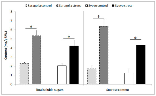 Changes in total soluble sugars and sucrose content (mg/g Fresh Weight) in Saragolla and Svevo leaves after 5 days of osmotic stress treatment with 18% PEG-6000 (w/v). Data are presented as mean ± SD from at least 3 independent experiments; * p < 0.05 (Student’s t-test).