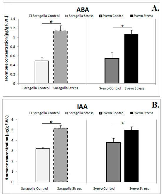 Phytohormones are essential regulators of numerous plant growth and development processes, exerting their fundamental action under both physiological and stress conditions [21,23]. Hence, the modulation of phytohormone levels and their crosstalk are among the most important processes for acquiring tolerance to environmental stresses. For instance, fine-tuning between ABA and auxin levels plays a key role in regulating stomatal movement in response to water stress [24]. ABA and IAA levels were determined under control and drought stress in Saragolla and Svevo seedlings (Figure 2). The results demonstrated that, under well-watering conditions, no difference in the amounts of ABA and IAA was observed. In contrast, PEG-6000 treatment induced a significant increase in ABA and IAA content in both wheat cultivars, although to a slightly greater extent in the Saragolla variety. Indeed, Figure 2A shows that under drought stress, ABA increased by about 56.9% in Saragolla and 49.2% in Svevo, while IAA, as shown in Figure 2B, increased by approximately 37.8% in Saragolla and 24.4% in Svevo compared to control conditions.