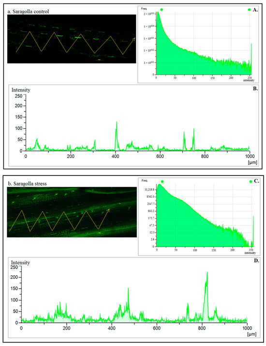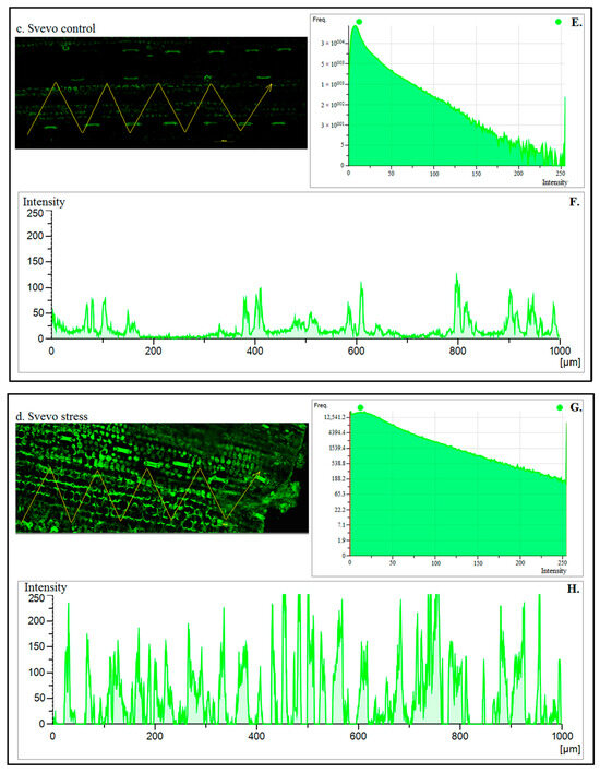 Confocal microscopy images showing the calcium-mobilizing effects in control (a,c) and PEG-6000 treatment (b,d) conditions. The pixel intensity–frequency histogram (A,C,E,G) and bar charts of the fluorescence intensity (B,D,F,H) of seedlings in response to the osmotic stress (A,B—Saragolla Control; C,D—Saragolla Stress; E,F—Svevo Control; G,H—Svevo Stress). Each pixel on the yellow line has been drawn in (a–d). Note that under treatment in the Svevo cultivar, there is a significant increase in the intracellular free calcium level [Ca2+], with an extremely high intensity of green, compared to Saragolla and the respective control.