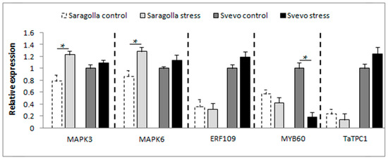 Transcript levels of MAPK3/6, ERF109, MYB60, and TaTPC1 in leaves of Saragolla and Svevo seedlings under control and osmotic stress determined using RT-qPCR. Data are presented as mean ± SD from at least 3 independent experiments; * p < 0.05 (Student’s t-test).