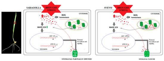 The increase in cytoplasmic Ca2+ governs the phosphorylation of different MAPKs that, on their side, can regulate the expression of transcription factors (TFs) involved in responses to osmotic stress [53]. Despite the strong relationship between the activation of MAPK and Ca2+ signaling, it is also known that excessively high stromal Ca2+ concentration can inhibit this process [53]. This phenomenon may justify the increased expression of MAPK3/6 observed in Saragolla compared to Svevo, where Ca2+ levels remain lower than in the other variety. Downstream of MAPK activation, many TFs are involved in drought stress responses. In particular, since the release of the MYB and ERF TFs triggers chloroplast-to-nucleus signaling required for the regulation of stomatal movements [54], the expression of two representative TFs, ERF109 and MYB60, was investigated. Our data showed that although water stress does not result in the activation of ERF109 in both varieties, the expression of this gene was higher in Svevo than in Saragolla under both control and stress conditions. As far as MYB60, it is an essential transcriptional regulator involved in monitoring water availability and fine-tuning plant responses to drought stress, including stomatal movements [55,56]. Under severe drought stress conditions, indeed, the downregulation of MYB60 induces stomatal closure [56]. Our data reveal that drought stress significantly inhibited MYB60 expression in Svevo, while no significant difference was observed in Saragolla. The inhibition of MYB60 expression is in agreement with the reduction in stomatal pores previously observed in Svevo by Licaj et al. [31], confirming that in response to water deprivation, Svevo is more prone to closing stomata compared to Saragolla, where the expression of MYB60 was not affected.