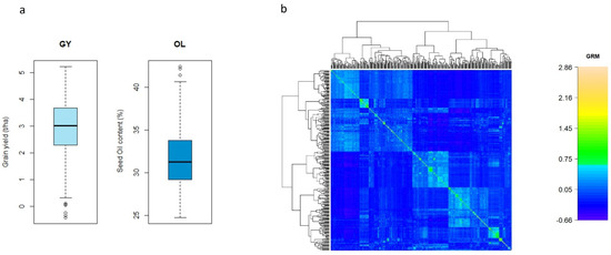 (a) Boxplot combined BLUEs for grain yield (GY) and seed oil content (OL) in 349 diverse safflower accessions. (b) Heatmap of genomic relationships based on genomic relationship matrix (GRM), where higher values indicate higher relatedness.