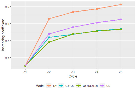 The inbreeding coefficient (F) showed an increasing trend for all GS strategies (Figure 4). A sharp increase was seen from the initial cycle to cycle two, followed by a gradual increase in average F, indicating a huge loss in genetic diversity in the first breeding cycle. GS_GY had a higher inbreeding coefficient than GS_OL. Compared with single-trait GS strategies, GS_GY + OL and GS_GY + OL + Rel had lower inbreeding coefficients. GS_GY + OL + Rel had lower inbreeding than GS_GY + OL did at cycle two; however, the difference between the two multi-trait strategies was minimal after cycle two, which could indicate that the small population size makes inbreeding inevitable to a great extent.