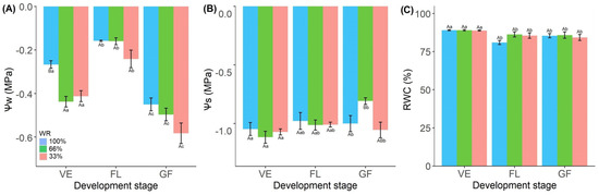 Leaf water potential (Ψw) decreases as soil water availability increases (Figure 1A), independently during the vegetative, flowering, and grain-filling stages (Figure 1A). We observed the lowest Ψw values in plants with 100% FC water saturation at the FL stage (Table S1).
