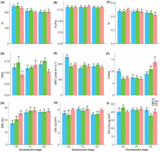 Minimum fluorescence (F0) (A), the potential quantum yield of PSII (Fv/Fm) (B), the effective quantum yield of PSII (YII) (C), non-photochemical quenching coefficient (NPQ) (D), apparent electron transport rate (E) and the ratio between ETR and photosynthetic assimilation rate (ETR/A) (F), electrolyte leakage rate (ELR) (G), carotenoids (Car) (H), total chlorophyll content (Chla+b) (I) in Raphanus sativus plants exposed to three water levels: 100% (control), 66% and 33% of field capacity (FC) and at three phenological stages of development: vegetative (VE), flowering (FL) and grain filling (GF). The bars represent mean values ± SE (n = 4). Mean values with different letters differ significantly according to Tukey’s test (p ≤ 0.05). Uppercase letters show the differences between water replacement within each developmental stage, and lowercase letters show the differences between developmental stages in each water replacement.