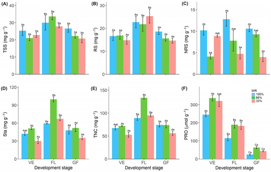 Total soluble sugars (TSS) (A), reducing sugars (RS) (B), non-reducing sugars (NRS) (C), starch (Sta) (D), total non-structural carbohydrates (TNC) (E), free proline (PRO) content (F) in Raphanus sativus plants exposed to three water levels: 100% (control), 66% and 33% of field capacity (FC) and at three different phenological stages of development: vegetative (VE), flowering (FL) and grain filling (GF). The bars represent mean values ± SE (n = 4). Mean values with different letters differ significantly according to Tukey’s test (p ≤ 0.05). Uppercase letters show the differences between water replacement within each developmental stage, and lowercase letters show the differences between developmental stages in each water replacement.