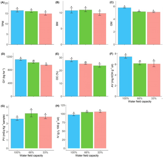 The water deficit reduced grain oil content. Compared to the control, plants treated with 33% FC obtained the lowest oil content (OC) and AV values (Figure 5E,F). The water deficit did not affect the PV (Figure 5G) or IV (Figure 5H) crude oil content of R. sativus (Table S2).