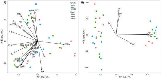 Biplot variation for physiological parameters (A) and productivity (B) in Raphanus sativus plants exposed to three water levels: 100% (control), 66%, and 33% of field capacity (FC). The bars represent mean values ± SE (n = 4 in (A); n = 12 in (B)). Pre-dawn leaf water potential (Ψw), leaf osmotic potential (Ψs), relative water content (RWC), photosynthetic net assimilation rate (A), stomatal conductance (gs), transpiration rate €, the ratio between internal and external CO2 concentration (Ci/Ca), instantaneous carboxylation efficiency (A/Ci), water use efficiency (WUE), minimum fluorescence (F0), the potential quantum yield of PSII (Fv/Fm), the effective quantum yield of PSII (YII), non-photochemical quenching (NPQ), apparent electron transport rate (ETR), the ratio between ETR and photosynthetic assimilation rate (ETR/A), electrolyte leakage rate (ELR), carotenoids (Car), total chlorophyll (Chla+b), proline content (Pro), total soluble sugars (TSS), reducing sugars (RS), non-reducing sugars (NRS), starch (Sta), total non-structural carbohydrates (TNC), total pod matter (TPM), bark matter (BM), grain matter of 100 pods (GM), grain yield (GY), grain oil content (OC), acid value (AV), peroxide value (PV) and iodine value (IV).
