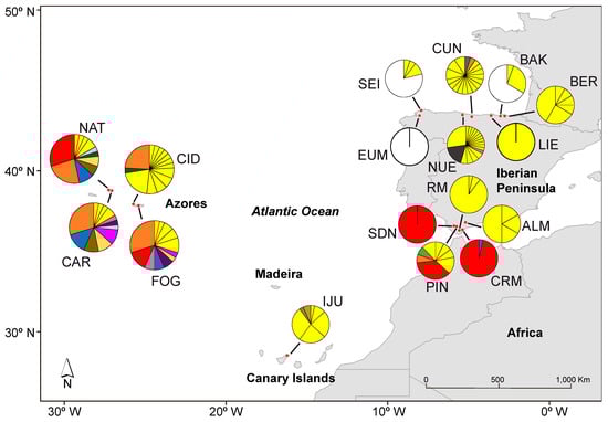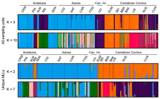 The results of STRUCTURE with and without clones are notably consistent with each other (Figure S6); although without clones, the structure is soon lost from K = 8, and the optimum number of selected clusters decreases from K = 3 and K = 10 (according to the ΔK and Puechmaille method, respectively) with clones up to K = 2 and K = 7 without clones. When K = 2 (optimal K without clones; Figure S6), one cluster was formed by the populations from Andalusia (minus RM), the Azores, and the Canary Islands, and another comprising the populations of the Cantabrian Cornice and RM (Andalusia); although NUE and CUN (the Cantabrian Cornice) had individuals more clearly defined as belonging to the first cluster (Figure 3). When K = 3 (optimal K with clones; Figure S6), a third cluster related the populations of RM, PIN (11 individuals of 30), IJU, several individuals of SEI and BER, NUE (18 individuals of 30), and CUN. Regarding the possibility of substructure (according to the Puechmaille method), for K = 10, the resulting clusters largely reflect the relationships found according to the pairwise FST values (i.e., ALM/CRM-PIN-SDN/RM/IJU-PIN/BER/EUM-SEI-BAK/LIE/NUE-CUN). The Azores populations appeared differentiated from the rest, although with a great mix between those of other clusters. Thus, most of the individuals from the Azores formed two clusters (pink and green in Figure 3), and many other individuals were better explained as belonging to clusters typical of other regions. The Andalusian population PIN showed a clear internal structure corresponding exactly to two intra-population nuclei (Figure 3).