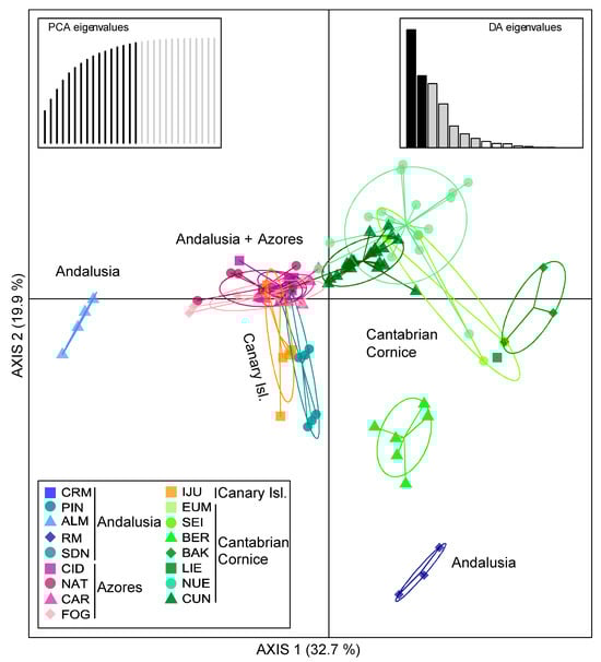 The DAPC analysis defined the relationships between the populations studied that closely reproduced the substructure that resulted in STRUCTURE, and the relationships identified with the pairwise FST values (Figure 4). The analysis suggested via the cross-validation that 16 principal components explained 95.6% of the variance in the original data. The resulting eigenvalues advised the inclusion of seven discriminant functions. Discriminant Function 1 explained 32.7% of the genetic variance, showing the differentiation between: the ALM population (Andalusia); the set of populations of the Azores, the rest of Andalusia (except RM), and the Canary Islands; the populations of the Cantabrian Cornice CUN, NUE, and BER, together with the Andalusian RM; and finally, the rest of the Cantabrian populations. Discriminant Function 2 explained 19.9% of the variance and differentiated the populations IJU (the Canary Islands), PIN (only individuals of an intra-populational nucleus) and RM (Andalusia), and BER (the Cantabrian Cornice) from the rest of the populations. The DAPC variable loadings included in the analysis revealed that loci CM35, AT45m1, and AT9 (for Discriminant Function 1), and CM1A and AT30 (for Discriminant Function 2), provided the highest resolution values for the individual assignment (Figure S7). Discriminant Function 3, which explained 17.8% of the genetic variance, clearly differentiated ALM and, to a lesser extent, the Cantabrian populations from the rest of the populations due to the resolutions of the AT45m1 and AT9 loci (Figure S7).