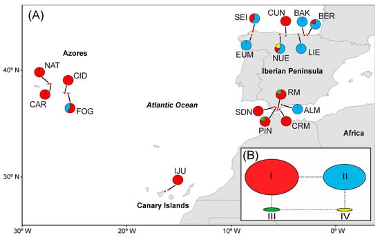 ptDNA information of the populations sampled. (A) Distribution of the ptDNA haplotypes (pie charts represent the frequency of each haplotype per location); (B) inferred ptDNA network, following the statistical parsimony method, with TCS software v1.21. Note that, in (A), the pie chart size is the same for all locations and does not represent the number of individuals. In (B), Roman numerals are the designation provided to haplotypes and circle sizes are proportional to haplotype frequencies. The color assigned to each haplotype is the same in (A,B). See Table 1 for full name of locations.