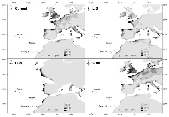 For all the models, the AUC values were high (minimum value of AUC = 0.990). The MAXENT current and LIG predictions showed regions of suitable habitats that coincided largely with the species’ current distribution, with additional areas of its distribution range in the European Atlantic coasts further north and the Mediterranean Sea, where the species is currently absent (Figure 6 and Figure S8). According to LGM outputs, refugia were located in Macaronesia, the coast of Portugal, Galicia (where C. macrocarpa is currently present), and the European Atlantic coast (at latitudes of the present north of France and south of Great Britain, where the species is currently absent). Palaeodistribution modeling suggested no suitable habitats for C. macrocarpa on the northern coast of Spain (except in Galicia) where the species is currently found. The MAXENT future projections (year 2080) using the RCP8.5 scenario suggested a partial reduction in suitable habitats on the coasts of Portugal, northern Iberian Peninsula, and Macaronesian islands together with an increase in suitable habitats northward of the European Atlantic coast.