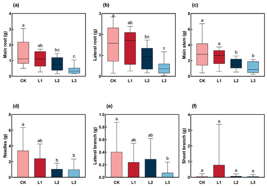 2.2. Response of Biomass Accumulation in Various Organs of P. yunnanensis to Different Shading Intensities
