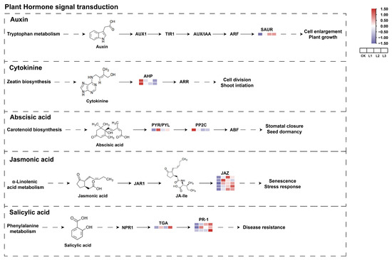 2.9. Response of Related Genes on the Hormone Signal Transduction Pathway to Different Shade Treatments
