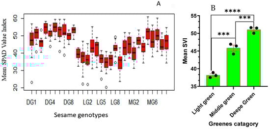 2.2. SPAD Value Index (SVI) Variation among Different Sesame Greenness Categories