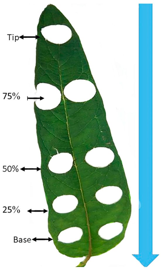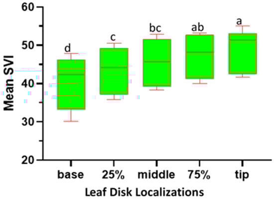 2.3. Variation in SPAD Value Index (SVI) across Different Leaf Disk Localizations along the Leaf Blade