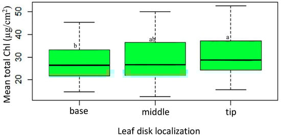 2.5.2. Variation in Chlorophyll Concentration across the Different Leaf Disk Localization along the Leaf Blade