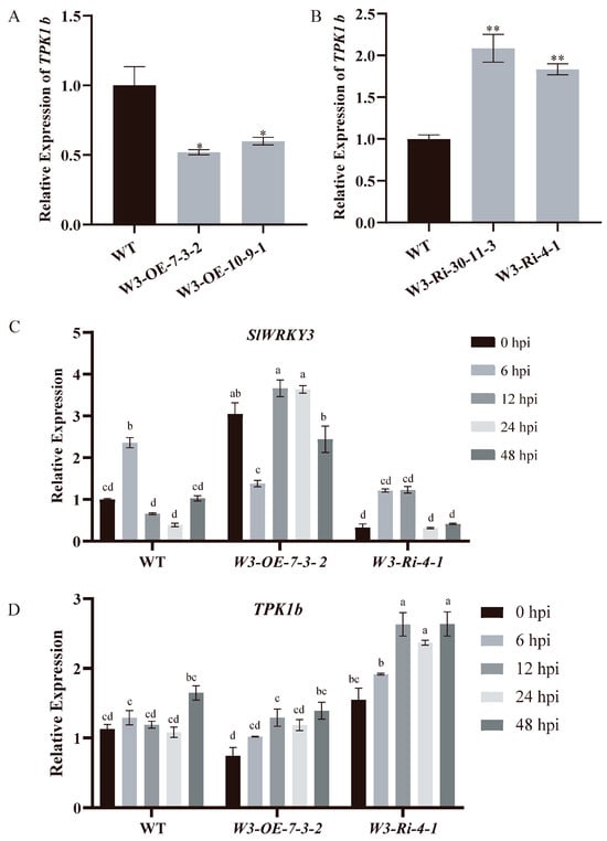 SlWRKY3 and TPK1b expression levels: (A,B): Relationship between expression levels of SlWRKY3 and TPK1b in SlWRKY3 transgenic lines. (Dunnett-t test p * < 0.05, p ** < 0.01.) (C,D): Changes in expression in SlWRKY3 and TPK1b in SlWRKY3 transgenic lines inoculated with B. cinerea. The relative gene expression levels at 0, 6, 12, 24, and 48 h post inoculation (hpi) of B. cinerea were detected by real-time fluorescent quantitative PCR technology. Statistically significant differences were determined using a One-Way ANOVA. Different letters indicate statistically significant differences.