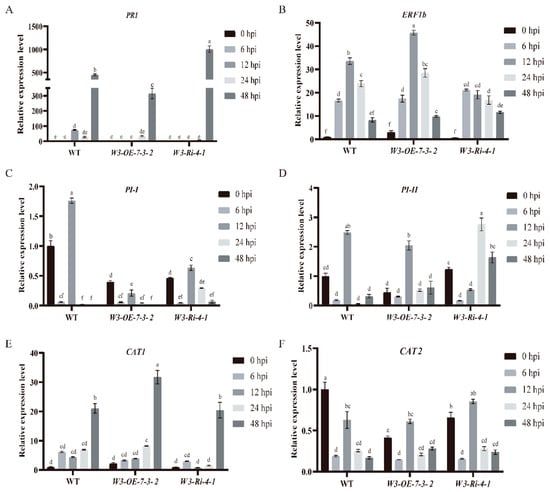 Expression level detection of related genes in SlWRKY3 transgenic plants after B. cinerea inoculation. (A–F): PR1, ERF1b, PI-I, PI-II, CAT1, CAT2 expression levels. Different letters indicate significant differences in gene expression between different time points. The relative gene expression levels at 0, 6, 12, 24, and 48 h post inoculation (hpi) of B. cinerea were detected by real-time fluorescent quantitative PCR technology. Statistically significant differences were determined using a One-Way ANOVA. Different letters indicate statistically significant differences.