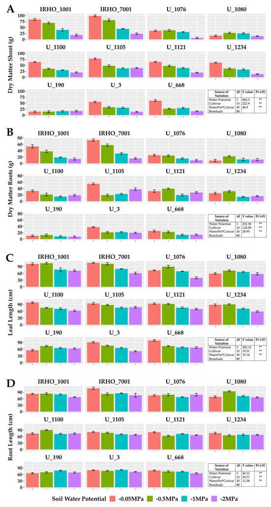 Growth variables in seedlings of 11 oil palm (Elaeis guineensis) cultivars subjected to four soil water potentials (−0.05 MPa, −0.5 MPa, −1 MPa, and −2 MPa) during 60 days of treatment. (A) Shoot dry matter. (B) Root dry matter. (C) Leaf length. (D) Root length. Each box corresponds to the mean ± SD. (n = 15). The tables in each panel correspond to the two-way ANOVA with significance levels. ** highly significantly different p ≤ 0.01.