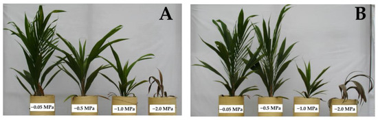 Physical appearance of two oil palm (Elaeis guineensis) cultivars subjected to four soil water potentials (−0.05 MPa, −0.5 MPa, −1 MPa, and −2 MPa) during 60 days of treatment. (A) IRHO 7001 cultivar. (B) U-1221 cultivar.
