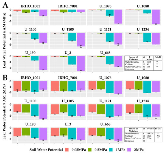 Leaf water potential of seedlings of 11 oil palm (Elaeis guineensis) cultivars subjected to four soil water potentials (−0.05 MPa, −0.5 MPa, −1 MPa, and −2 MPa) during 60 days of treatment. (A) Predawn (4:00 AM) leaf water potential. (B) Actual (9: 00AM) leaf water potential. Each box corresponds to the mean ± SD. (n = 15). The tables in each panel correspond to the two-way ANOVA with significance levels. NS: not significant; ** highly significantly different p ≤ 0.01.