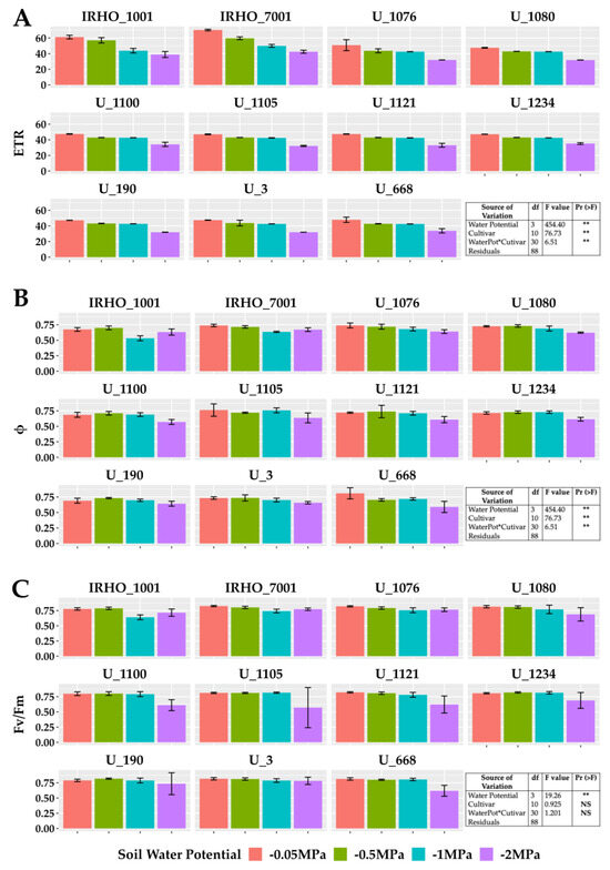Chlorophyll A fluorescence parameters of seedlings of 11 oil palm (Elaeis guineensis) cultivars subjected to four soil water potentials (−0.05 MPa, −0.5 MPa, −1 MPa, and −2 MPa) during 60 days of treatment. (A) ETR, electron transfer rate. (B) Φ, quantum yield of PSII. (C) Fv/Fm, maximum quantum yield of PSII. Each box corresponds to the mean ± SD. (n = 15). The tables in each panel correspond to the two-way ANOVA with significance levels. NS: not significant; ** highly significantly different p ≤ 0.01.
