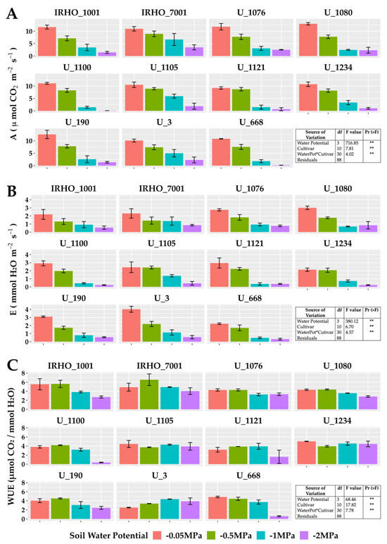 Gas exchange parameters of seedlings of 11 oil palm (Elaeis guineensis) cultivars subjected to four soil water potentials (−0.05 MPa, −0.5 MPa, −1 MPa, and −2 MPa) during 60 days of treatment. (A) A, photosynthetic rate. (B) E, transpiration. (C) WUE, water use efficiency of photosynthesis. Each box corresponds to the mean ± SD. (n = 15). The tables in each panel correspond to the two-way ANOVA with significance levels. NS: not significant; ** highly significantly different p ≤ 0.01.