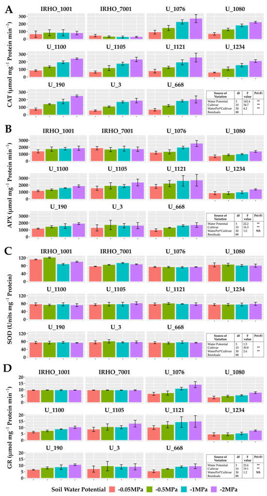 Antioxidant enzyme activity of seedlings of 11 oil palm (Elaeis guineensis) cultivars subjected to four soil water potentials (−0.05 MPa, −0.5 MPa, −1 MPa, and −2 MPa) during 60 days of treatment. (A) Catalase activity. (B) Ascorbate peroxidase activity. (C) Superoxide dismutase activity. (D) Glutathione reductase activity. Each box corresponds to the mean ± SD. (n = 15). The tables in each panel correspond to the two-way ANOVA with significance levels. NS: not significant; ** highly significantly different p ≤ 0.01.