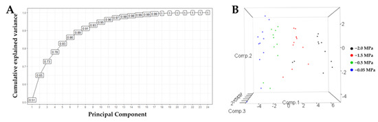 Principal Component Analysis for 22 variables of seedlings of 11 oil palm (Elaeis guineensis) cultivars subjected to four soil water potentials (−0.05 MPa, −0.5 MPa, −1 MPa, and −2 MPa) during 60 days of treatment. (A) Cumulative variability curve of the sample explained by the consecutive principal components. (B). Grouping of cultivars according to three principal components.