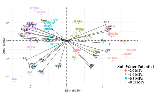 To obtain a more specific view of the interactions of the variables and cultivars in each strain, a PCA was performed in each treatment (Figure 9), and a differential response of the cultivars to each water level in the soil and notable change in the importance of the variables against the response of the plants were found. In the −0.05 MPa treatment, when all plants were grown under good water conditions, the most significant variance was due to growth, osmolyte accumulation, and respiration in both roots and leaves. When plants are subjected to mild stress (−0.5 MPa), the variance is explained by water potential, biomass, ABA, and osmolyte variables. Under moderate stress (−1 MPa), ABA increases as a high source of variation along with antioxidant enzymes and osmolytes, and gas exchange factors are added. When stress is severe (−2 MPa), the most relevant variables are catalase activity, osmolytes, gas exchange, water potential, and ETR.