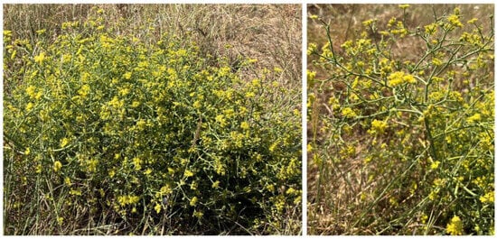 The name Echinophora originates from ancient Greek and is composed of the words echino (spine) and phora (leaf), which describe the spiny leaves of the species within the genus [2]. The genus is distributed in regions of the Mediterranean and the Balkan Peninsula, Anatolia, eastward to Iran and Afghanistan [3]. Three of the species, namely E. chrysantha, E. lamondiana, and E. trichophylla, are endemic to Turkey, while E. platyloba and E. cinerea are endemic to Iran [1,3]. In Europe, the genus is represented by E. spinosa, E. tenuifolia, and E. tenuifolia subsp. sibthorpiana (or E. sibthorpiana) (Figure 1), the latter being the most widely distributed species from the genus that can be found in numerous countries, including countries of the Balkans (Greece, Bulgaria, and North Macedonia), Turkey, and Iran [1,3,4,5,6]. E. spinosa is a halophytic plant distributed in the sandy coastal regions of the Mediterranean, found in South Europe (including France, Italy, Montenegro, and Greece), as well as the coastal regions of Northern Africa, including Algeria, and more recently, Tunisia [7,8,9,10].