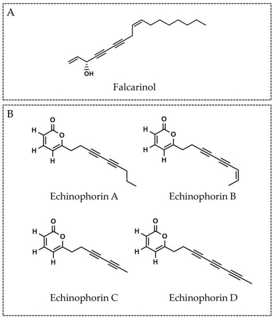 Structures of polyacetylenes from the Echinophora genus (A) Falcarinol and (B) Echinophorins A–D, isolated from E. cinerea and E. platyloba [2,17].