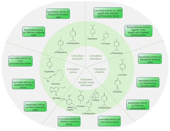 The EOs isolated from Echinophora species demonstrated promising insecticidal and larvicidal properties underlying their potential use as biopesticides and insect repellents (Figure 3) [7,45,59,62,65].