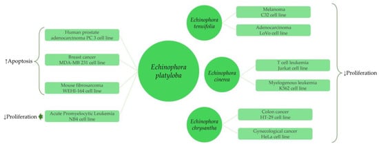 Species belonging to the genus Echinophora (Apiaceae) have been used by humanity since ancient times as flavoring agents, preservatives, and medicines for the treatment of a broad spectrum of conditions, including respiratory, digestive and kidney disorders, fungi infections, wounds, and gastric ulcers. Phytochemical studies on this botanical genus mainly investigate the essential oil composition and reveal the species as a rich source of volatile compounds, including monoterpenes and phenylpropanoids. Among the non-volatile secondary metabolites, flavonoids, coumarins, phenolic acids, phytosterols, and polyacetylenes have been identified. Pharmacological studies revealed Echinophora extracts and essential oils exhibit different biological properties, including antibacterial, antifungal, anticancer, insecticidal, anti-inflammatory, and hepatoprotective activities. However, compared to other genera, the biological activity and chemical diversity of this genus are not well studied. In future decades, it is highly likely that the small genus Echinophora will play an important role in drug discovery and drug development.
