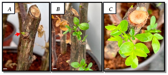 Cultivation of B. fagaroides cuttings at (A) 12, (B) 25 and (C) 70 days. Bar = 0.5 cm.