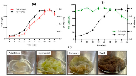 Growth kinetics tests were performed in triplicate by placing an inoculum with 1 g of fresh biomass per flask with the previously mentioned culture conditions and incubating it for a photoperiod of 16 h light/8 h dark at 25 ± 2 °C. Fresh and dry biomass was determined at seven-day intervals after inoculation up to 63 days. During the assay, the weight of fresh biomass was recorded by placing it on previously weighed filter paper. Subsequently, to determine the dry biomass, the plant material was lyophilized at −50 °C and 0.1–0.3 mBar until a constant weight was reached. The callus growth curve was plotted with the culture time against the weights of the fresh and dry biomasses to show the phases of cell growth (adaptation, exponential, stationary and death). Kinetic parameters were calculated: the specific growth rate µ (time−1), the cell doubling time (td) using the following formula td = ln(2)/μ [15,16,17,18,19,20,21,22,23] and the growth index (GI) given by the final dry biomass minus the initial dry biomass divided by the initial dry biomass.