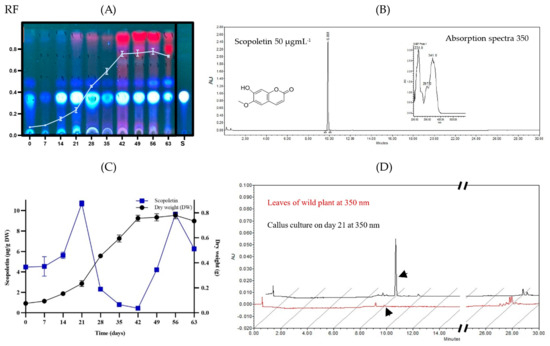 Finally, the scopoletin production of the extract from the callus culture was compared against that of the extract from the leaves of the wild plant, and it was observed that the accumulation of scopoletin in the wild plant was low with respect to the callus culture (Figure 4D).