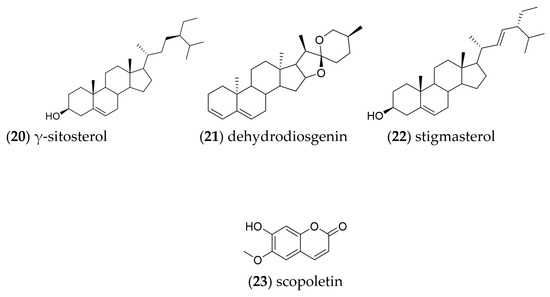 Open column fractionation of the callus culture dichloromethane extract allowed the identification of the following compounds by gas chromatography coupled to mass spectrometry: gamma-sitosterol (20), dehydrodiosgenin (21), stigmasterol (22) and scopoletin (23) (Figure 5). Chromatograms are displayed in Figures S3–S5 (Supporting Information).