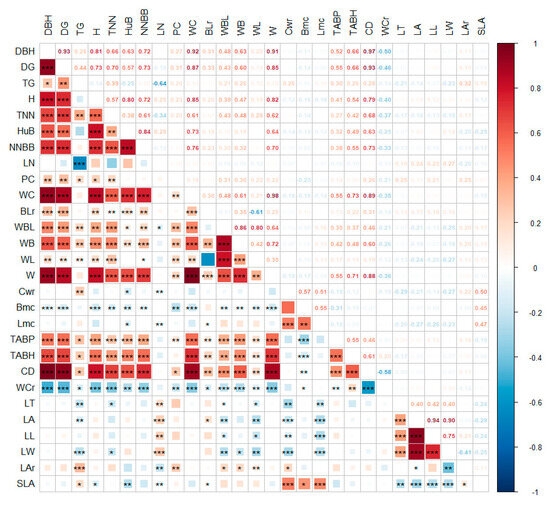 Correlation between phenotypic traits of moso bamboo. *: p < 0.05; **: p < 0.01; ***: p < 0.001.