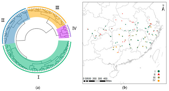 113 moso bamboo germplasm resource clusters: (a) cluster map of 113 moso bamboo germplasm resources; (b) distribution of different taxa of moso bamboo in China.
