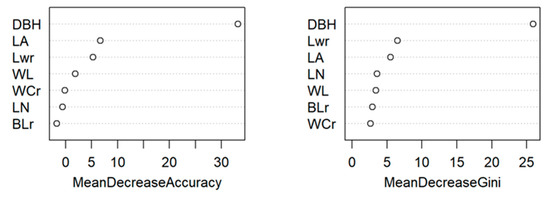 A random forest discriminant model was constructed to classify and predict the four taxa using seven phenotypic characters, namely, breast diameter, leaf area, leaf weight, branch-to-leaf ratio, leaf water content, wall-to-cavity ratio, and node length. From 113 germplasm, 70% of the samples were selected as the training set, and 30% were made as the independent test set. The random forest algorithm was used to train the training set to construct the prediction model, and the number in the random forest was 500, and when the number of model node variables was 6, the mean of the model misclassification rate was the lowest at 26.58%, and the prediction accuracy of its cross-validation was 70.59% (Table 6). The importance of the phenotypic traits of moso bamboo based on the random forest classification output is shown in Figure 3. The significance of the average reduction in accuracy is in the following order: diameter of breast > leaf water content > leaf area > diameter of breast node length > leaf weight > branch-to-leaf ratio > wall cavity ratio. The established random forest discriminant model can effectively discriminate different types of germplasm and verifies that these seven phenotypic traits can be used as indicators to evaluate the germplasm resources of moso bamboo.