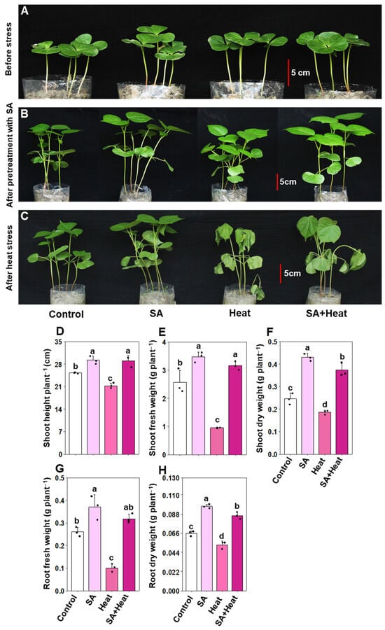Impact of exogenously applied salicylic acid (SA, 1 mM) on growth-related characteristics of cotton plants subjected to 48 h of heat stress. Representative images of cotton plants captured at different stages: (A) before priming with 1 mM SA (pretreatment), (B) after 10 days of 1 mM SA priming (pre-stress), and (C) following exposure to 48 h of heat stress. Growth parameters assessed include (D) shoot height per plant, (E) shoot fresh weight per plant, (F) shoot dry weight per plant, (G) root fresh weight per plant, and (H) root dry weight per plant under different treatments. Data are presented as mean values with standard deviations (n = 3). Statistically significant treatment differences, as assessed by the least significant difference (LSD) test (p < 0.05), are indicated by distinct letters above the bars. Treatments include water-treated non-stressed plants (Control), 1 mM SA-primed non-stressed plants (SA), water-treated heat-exposed plants (Heat), and 1 mM SA-primed heat-exposed plants (SA+Heat).