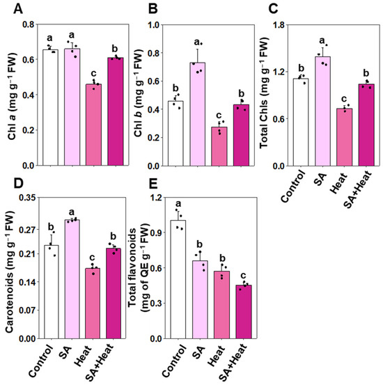 Impact of exogenously applied salicylic acid (SA, 1 mM) on the levels of photosynthetic pigments and flavonoids in cotton leaves subjected to 48 h of heat stress. (A) Chlorophyll a (Chl a), (B) chlorophyll b (Chl b), (C) total chlorophylls (total Chls), (D) carotenoids, and (E) total flavonoids in cotton leaves. Data are presented as mean values with standard deviations (n = 4). Statistically significant treatment differences, as assessed by the least significant difference (LSD) test (p < 0.05), are indicated by distinct letters above the bars. The treatments compared include water-treated non-stressed plants (Control), 1 mM SA-primed non-stressed plants (SA), water-treated heat-exposed plants (Heat), and 1 mM SA-primed heat-exposed plants (SA+Heat). Fresh weight (FW), quercetin equivalent (QE).