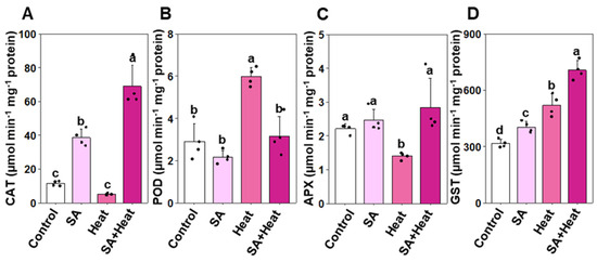 Impact of exogenously applied salicylic acid (SA, 1 mM) on the activities of key antioxidant enzymes in cotton leaves subjected to 48 h of heat stress. (A) Catalase (CAT), (B) peroxidase (POD), (C) ascorbate peroxidase (APX), and (D) glutathione S-transferase (GST) activities in cotton leaves. Data are presented as mean values with standard deviations (n = 4). Statistically significant treatment differences, as assessed by the least significant difference (LSD) test (p < 0.05), are indicated by distinct letters above the bars. Treatments include water-treated non-stressed plants (Control), 1 mM SA-primed non-stressed plants (SA), water-treated heat-exposed plants (Heat), and 1 mM SA-primed heat-exposed plants (SA+Heat).