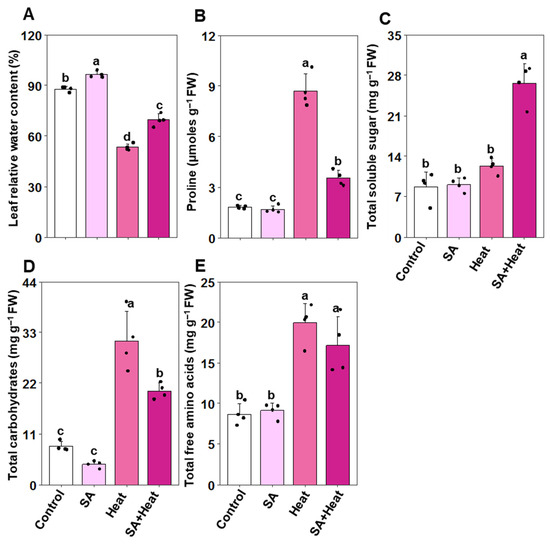 Impact of exogenously applied salicylic acid (SA, 1 mM) on various physiological and biochemical parameters in cotton leaves subjected to 48 h of heat stress. (A) Leaf relative water content, (B) proline, (C) total soluble sugars, (D) total carbohydrates, and (E) total free amino acid levels in cotton leaves. Data are presented as mean values with standard deviations (n = 4). Statistically significant treatment differences, as assessed by the least significant difference (LSD) test (p < 0.05), are indicated by distinct letters above the bars. Treatments include water-treated non-stressed plants (Control), 1 mM SA-primed non-stressed plants (SA), water-treated heat-exposed plants (Heat), and 1 mM SA-primed heat-exposed plants (SA+Heat). Fresh weight (FW).