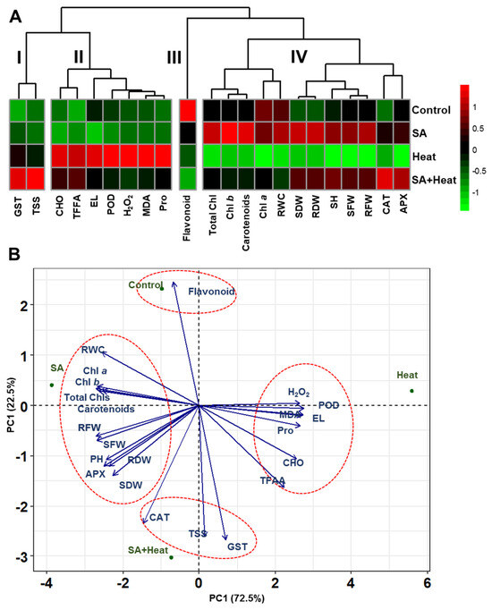 Clustering heatmap and biplot principal component analysis (PCA) illustrating the impact of salicylic acid (SA) priming on heat stress tolerance in cotton plants. (A) Clustering heatmap of normalized mean values showing the responses of various morphophysiological and biochemical parameters under different treatment combinations: water-treated non-stressed plants (Control), 1 mM SA-primed non-stressed plants (SA), water-treated heat-exposed plants (Heat), and 1 mM SA-primed heat-exposed plants (SA+Heat). The heatmap provides a comprehensive overview of the divergence in parameter responses across treatments. (B) Biplot PCA depicts correlations between parameters and treatments, with the first two principal components (PC1 and PC2) explaining 94.6% of the total variability in the dataset. Vector lines indicate the strength and direction of relationships between morphophysiological and biochemical parameters and treatments, with tiny angles denoting weak associations and wide angles indicating strong associations. Key parameters include plant height (PH), chlorophyll a (Chl a), shoot dry weight (SDW), chlorophyll b (Chl b), shoot fresh weight (SFW), root dry weight (RDW), root fresh weight (RFW), total chlorophylls (Total Chls), ascorbate peroxidase (APX), total free amino acids (TFAA), peroxidase (POD), total flavonoids (Flavonoid), glutathione S-transferase (GST), malondialdehyde (MDA), total carbohydrates (CHO), hydrogen peroxide (H2O2), electrolyte leakage (EL), proline (Pro), relative water content (RWC), and total soluble sugars (TSS).