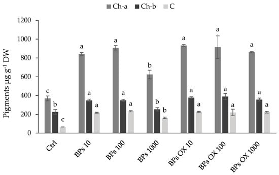 In Figure 1, the contents of chlorophylls and carotenoids, measured at the end of the experiment, are reported. All treated lettuces showed a great increase in all pigments with respect to the control. In particular, all treatments enhanced chlorophyll-a, showing a percentage increase with respect to the control from 69% (BPs 1000) to 152% (BPs OX 10). Chlorophyll-b was higher than the control in all the treated lettuce, except that treated with BPs 1000, which showed a value similar to the control. The trend of carotenoids was aligned with chlorophyll-a, with a percentage increase that was always over 100% in all treated lettuce with respect to the control.