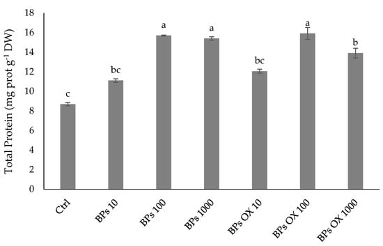 According to the morpho-biometric traits and pigments, the total protein content in lettuce subjected to all treatments was always significantly higher than that in the control (Figure 2), except for in those treated with BPs 10 and BPs OX 10, which showed values similar to the control. The best performances were obtained in the BPs OX 100, BPs 100 and BPs 1000 treatments, with an evident increase of 83%, 81% and 76% being recorded, respectively.